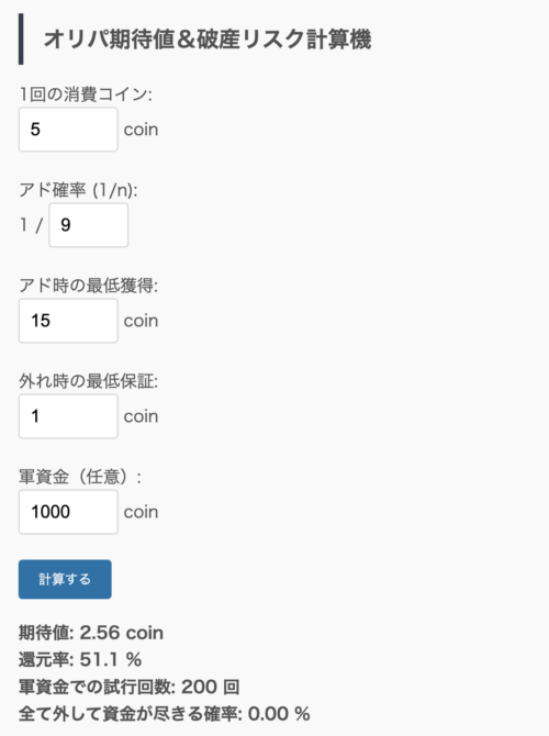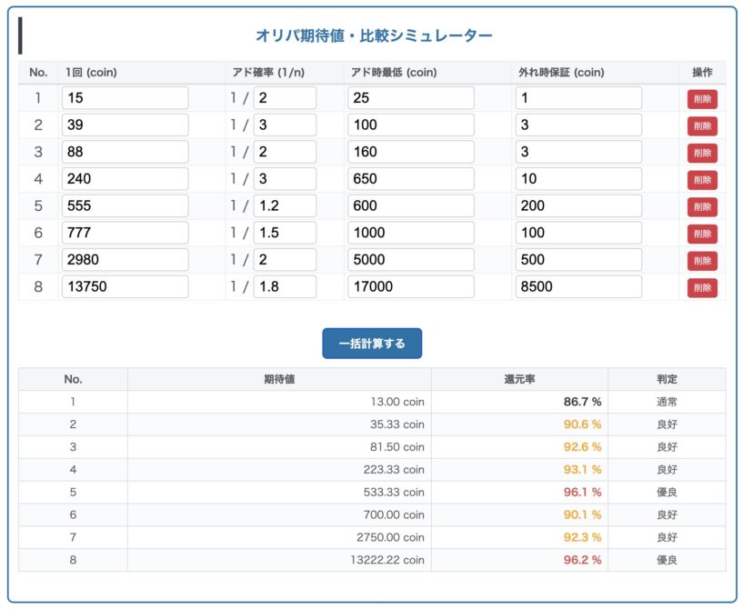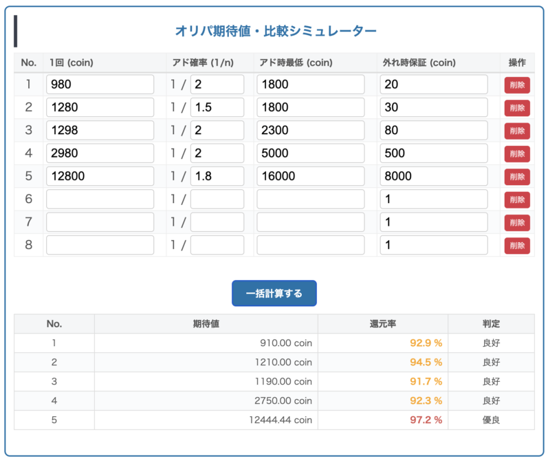 ただ “アド確率” と “アド時最低保障” が記載されていないオリパは計算できない